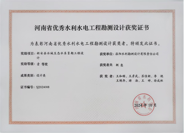 近日,河南省水利學(xué)會(huì)公布了2024年度河南省優(yōu)秀水利水電工程勘測(cè)設(shè)計(jì)獎(jiǎng),洛陽(yáng)水利勘測(cè)設(shè)計(jì)有限責(zé)任公司承擔(dān)的“新安縣水城生態(tài)水系Ⅱ期工程設(shè)計(jì)”、“洛陽(yáng)市十四五節(jié)水型社會(huì)建設(shè)規(guī)劃”和“洛寧縣水系連通及水美鄉(xiāng)村建設(shè)省級(jí)試點(diǎn)縣工程勘測(cè)(2022年度)”3個(gè)項(xiàng)目,分別榮獲設(shè)計(jì)類、技術(shù)咨詢類、勘測(cè)類3個(gè)一等獎(jiǎng)。