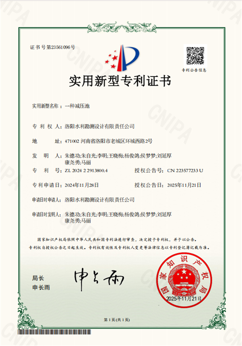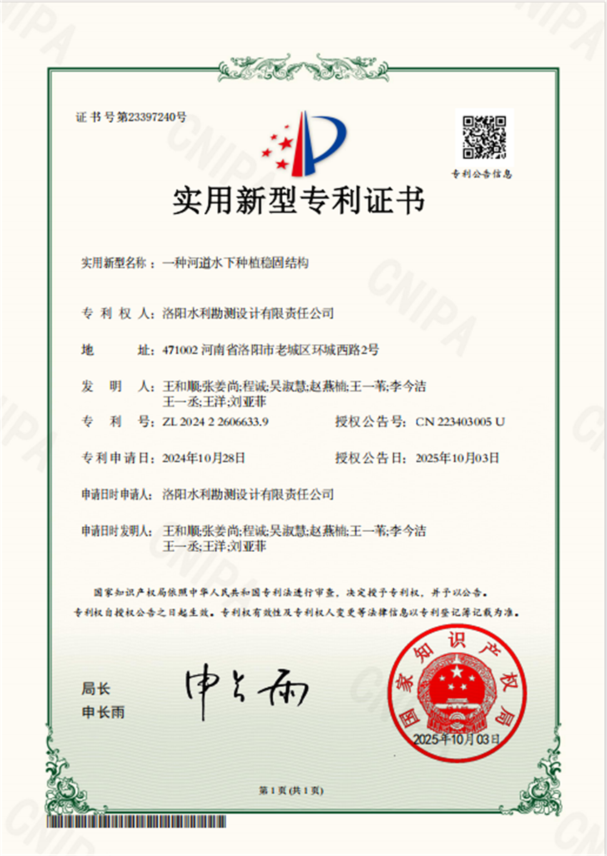 近日,洛陽(yáng)水利勘測(cè)設(shè)計(jì)有限責(zé)任公司申報(bào)的3項(xiàng)實(shí)用新型專利證書(shū)“一種河道水下種植穩(wěn)固結(jié)構(gòu)”、“一種輸水管道水錘預(yù)防裝置”和“一種減壓池”成功獲得國(guó)家實(shí)用新型專利授權(quán)。